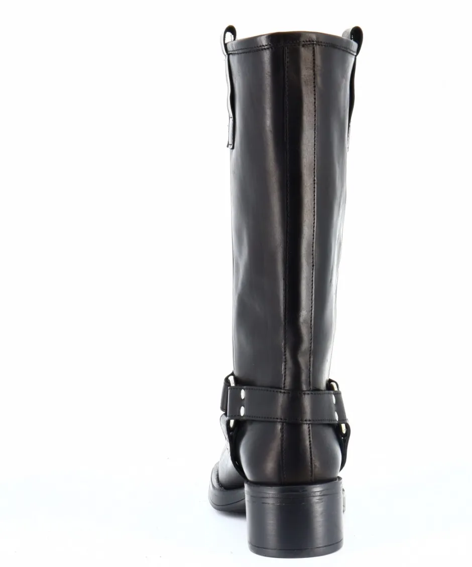 Le cuir noir de première qualité confère une texture douce et une durabilité exceptionnelle à ces bottes. Le bout carré crée une silhouette moderne et intemporelle, tandis que les détails métalliques argentés, les anneaux et les clous ajoutent une touche rebelle et sophistiquée.