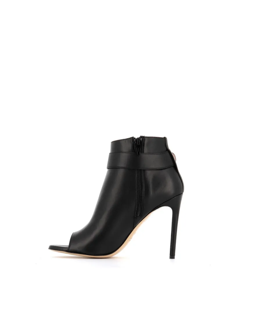 Elancez gracieusement votre silhouette sur les bottines Nadia, naturellement signées Osmose Paris. Réalisée artisanalement en Italie en cuir lisse noir, elles sont hissées sur un talon aiguille de 10 cm. Elles se terminent élégamment par un joli bout ouvert en amande et une bride cheville à fermeture à loquet.