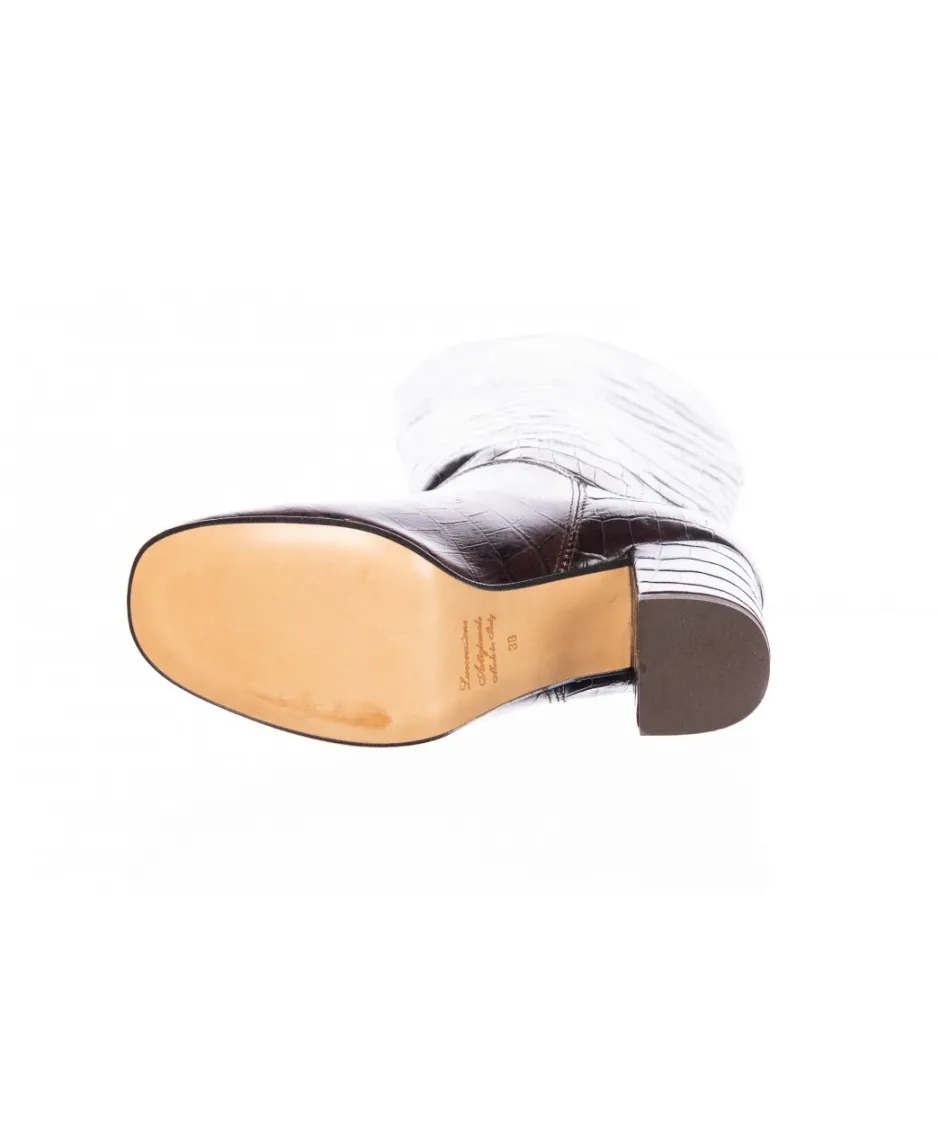 Voyager dans les sixties sur les nouvelles lignes de botte cavalière imprimée cuir croco marron à talon carré signée OSMOSE Shoes Paris. Cette saison, OSMOSE s’engage sur des lignes à bout rond & talon carré sur une hauteur agréable pour vous balader de jour comme de nuit, idéales pour mettre vos jambes en valeur. Le made in Italy au service de votre féminité sans vous ruiner c’est tout OSMOSE.