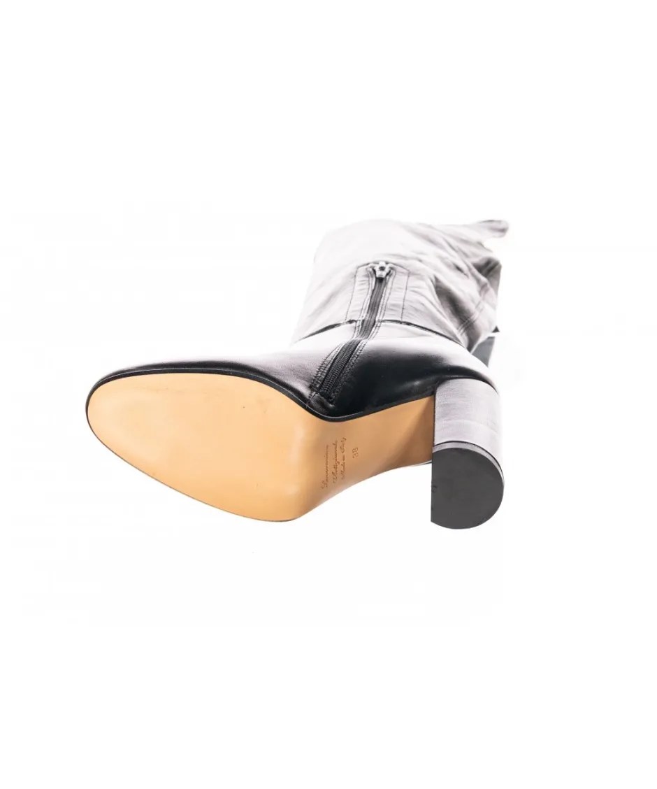 Embrassez cette tendance cuissarde sur la nouvelle signature OSMOSE Shoes Paris: cuir noir haute à tige fourrée sur une découpe bout rond et talon carré.