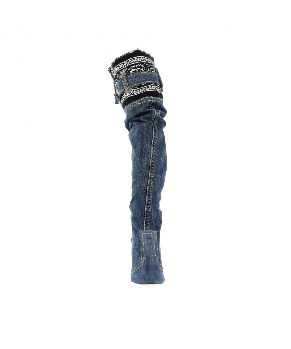 Cette paire de botte cuissarde a été réalisée en Italie a partie de récupération de pantalon en jeans denim usés recyclés.