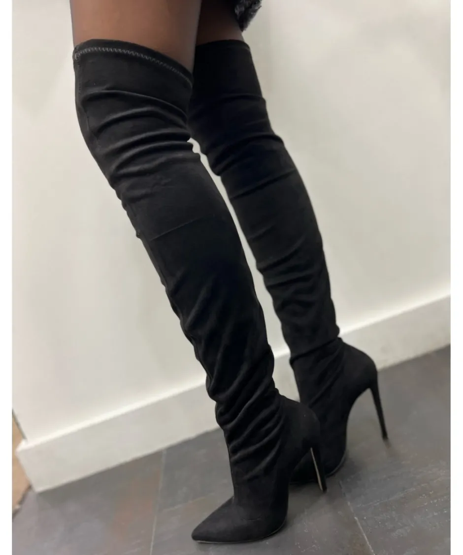 Adoptez une attitude résolument glamour et féminine avec les cuissardes « effet chaussette » Katy, signées Osmose Paris. Réalisées artisanalement en Italie en microfibre noir souple, elles arborent une silhouette pointue et reposent sur des talons aiguilles.