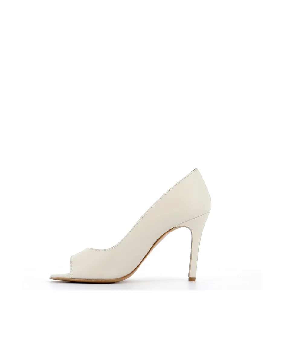 Prenez de la hauteur tout en confort avec les escarpins Lydia signés Osmose Paris. Réalisés artisanalement en Italie en cuir écru, ils arborent un bout ouvert et sont montés sur un talon aiguille haut de 11cm pour une démarche assurée en toute circonstance.