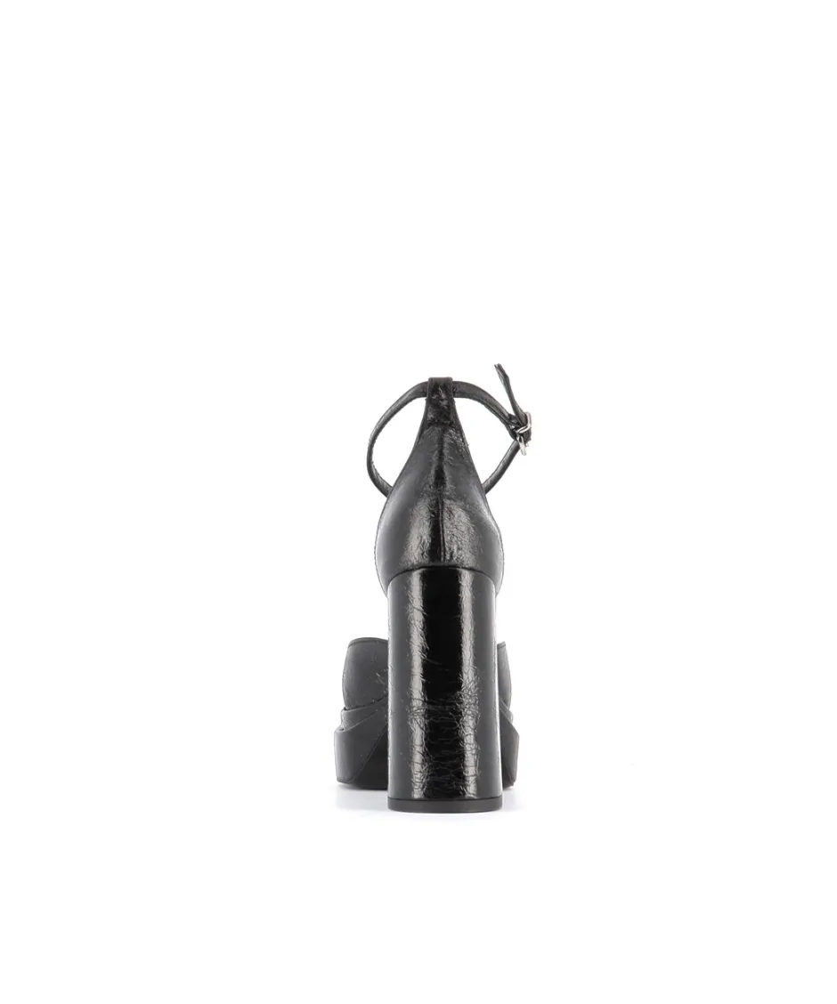 Prenez de la hauteur avec les escarpins Vera signés Osmose Paris. Réalisées artisanalement en Italie dans du cuir végan noir brillant, elles arborent une silhouette carrée et sont dotées de fines brides contrastant avec un vertigineux talon carré épais et d’une double plateforme.