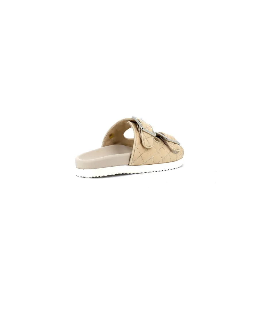 Sandales Mala, signées Osmose Shoes Paris, confectionnées en Italie en cuir beige matelassé en losange. Elles présentent des brides à boucles argentées et reposent sur une semelle intérieure moulée confortable.