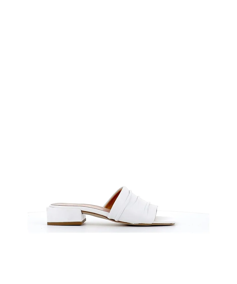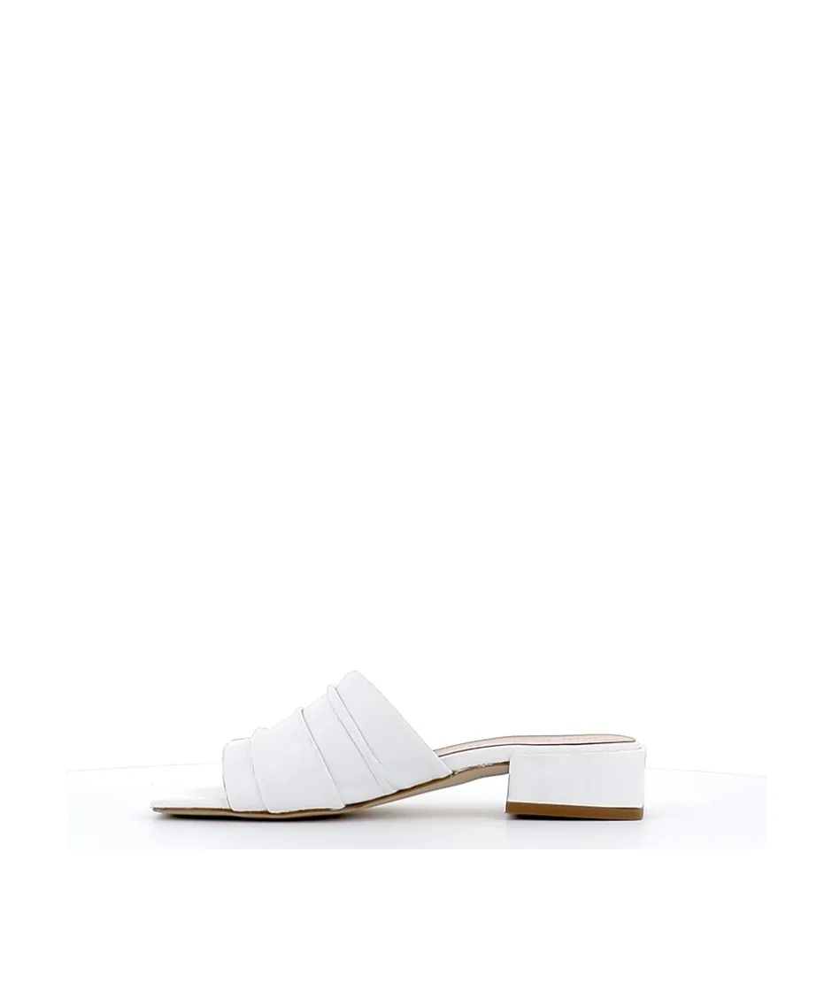 Apportez la touche finale à toutes vos tenues d鈥é avec les mules Livia, signée Osmose Paris. Confectionnée en Italie en cuir blanc, ces sandales intemporelles et passe-partout se démarque par sa large bride plissée et son épais talon discret et confortable.