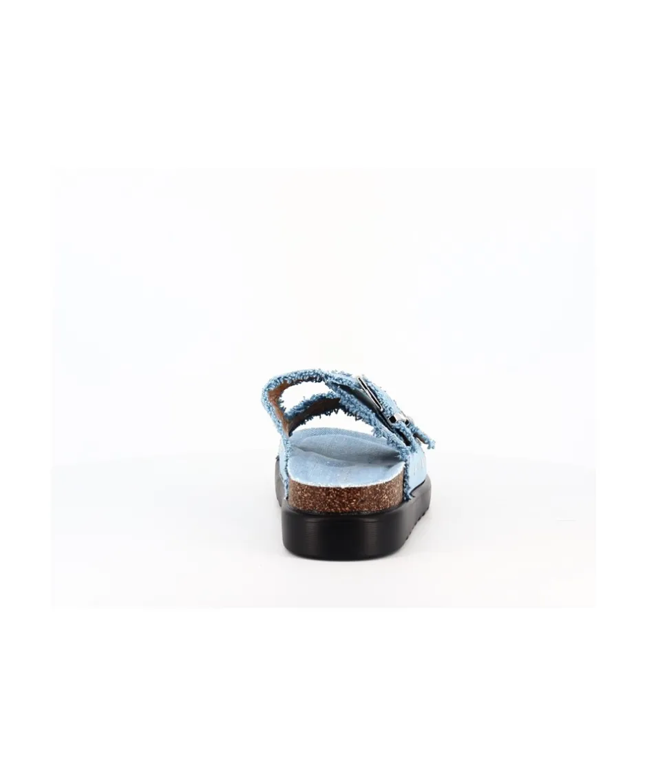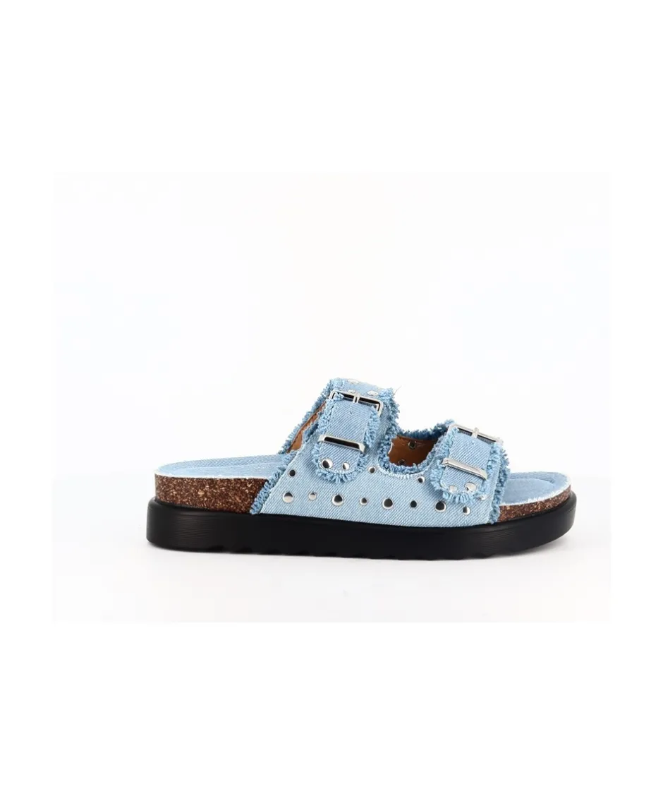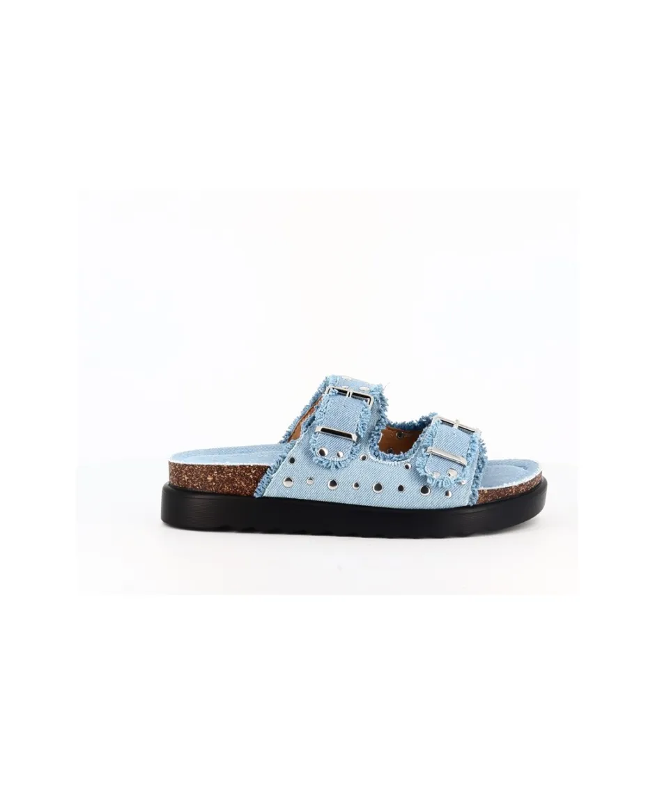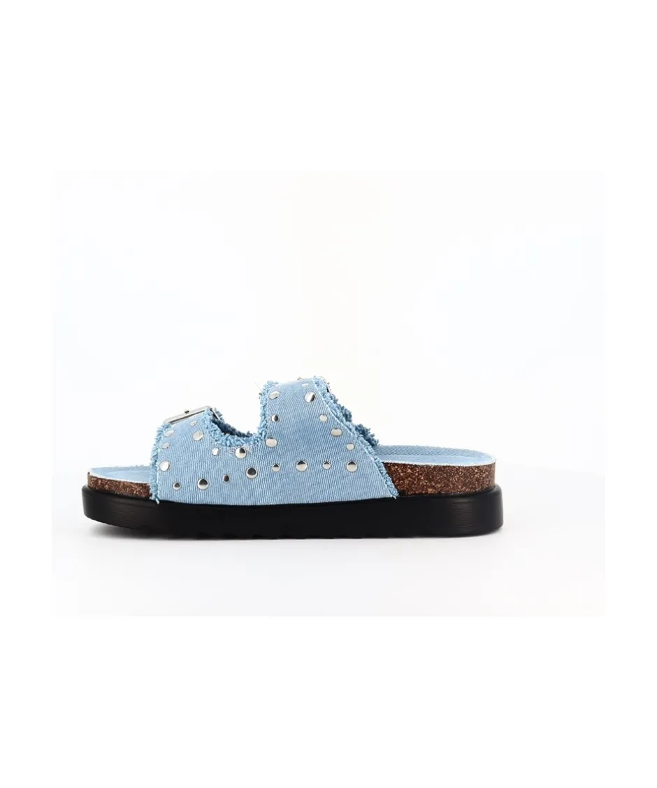 Offrez-vous une touche d’éclat avec ces sandales minimalistes à double bride. Confectionnées en denim jean clair et ornées de clous argentés, elles ajoutent une élégance décontractée à votre tenue.