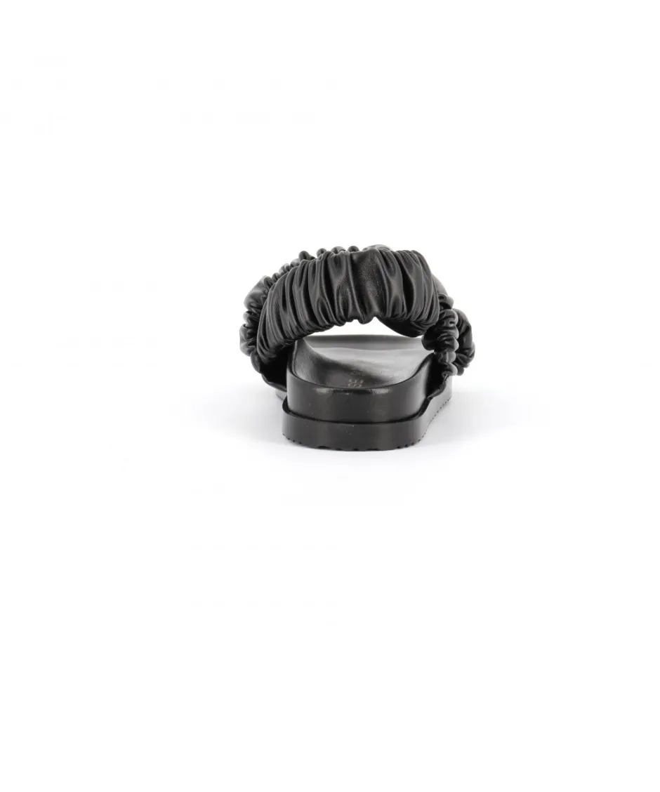 Sandale OSMOSE à la pointe de la mode, façonnée en Italie dans un épais cuir noir matelassé, cette paire vous séduira par son empeigne nouée et liée par un anneau doré, tandis que sa bride arrière élastiquée promet un maintien optimal.