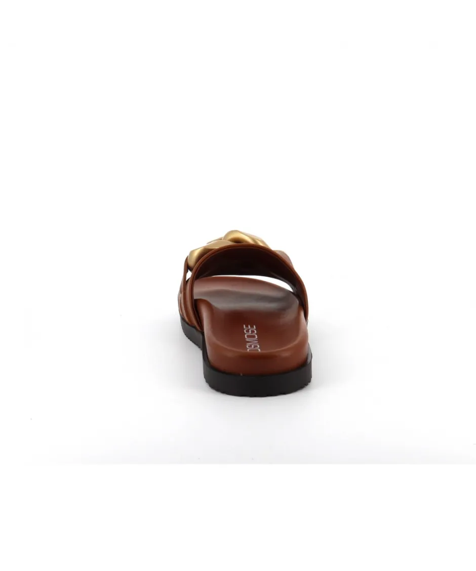 Osmose Shoes Paris met en avant ces claquettes Meda marron clair ornées d’une épaisse chaîne gourmette dorée. Confectionnées en Italie en cuir, elles présentent une large bride, une semelle intérieure cuir ton sur ton moulée confortable, et une semelle en caoutchouc.