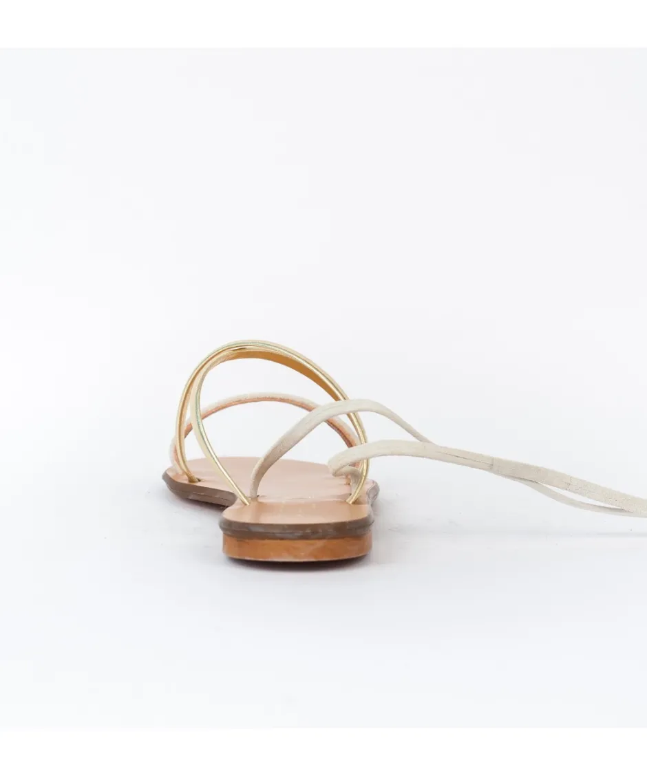 Faites de votre sandale Osmose shoes paris, l’atout charme de votre tenue. Confectionnée en Italie en daim beige et cuir platine, elle est montée sur une semelle plate tout confort et se dote de brides s’enroulant avec élégance autour du pied et de la cheville. Portez-la de jour comme de nuit.