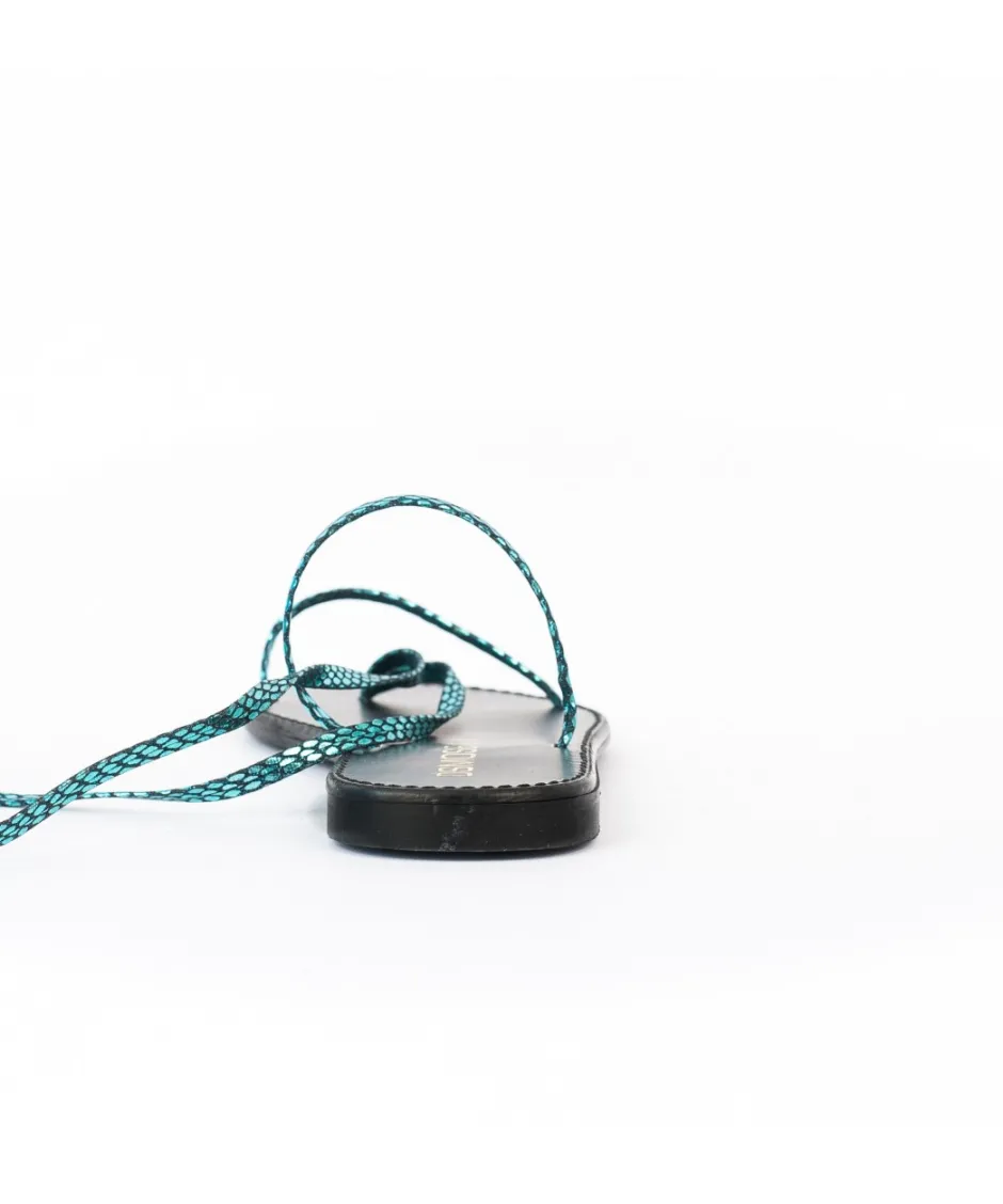 Faites de votre sandale Osmose shoes paris, l’atout charme de votre tenue. Confectionnée en Italie en cuir façon serpent vert pétrole, elle est montée sur une semelle plate tout confort et se dote de brides s’enroulant avec élégance autour du pied et de la cheville. Portez-la de jour comme de nuit.