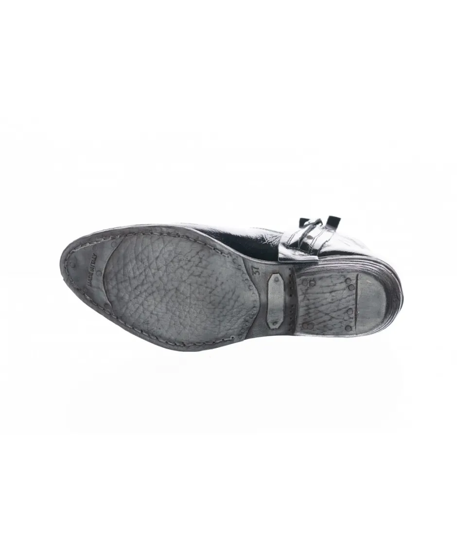 Osmose crée le modèle classique dans une version féminine et contemporaine avec ces bottines en Cuir Vernis Noir uni, et son bout arrondie renforcer par des détails métalliques.