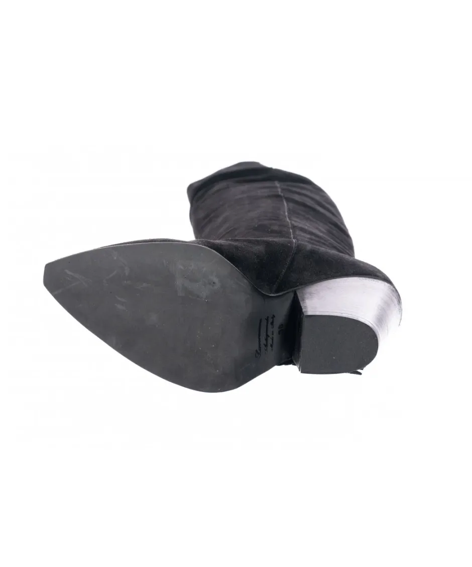 Laissez vous porter par la nouvelle signature de botte santiag femme signée OSMOSE Coutre Paris : botte tiag daim noir à franges cloutées & talon biseauté.