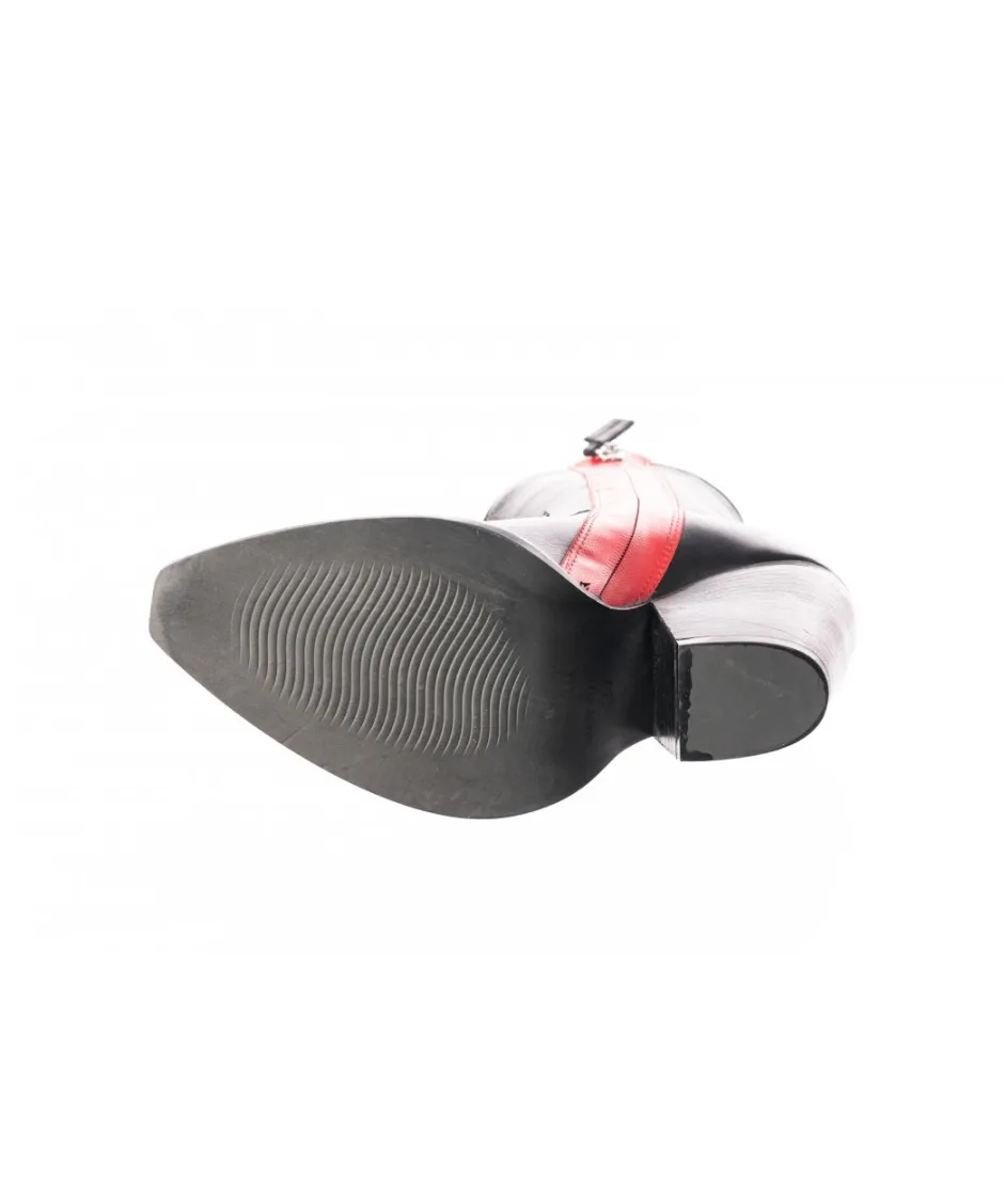Nouvelle tendance du moment à saisir sur la collection osmose_shoes Paris: la bottine western à talon biseauté, sur sa robe de cuir noir et son liceret rouge.