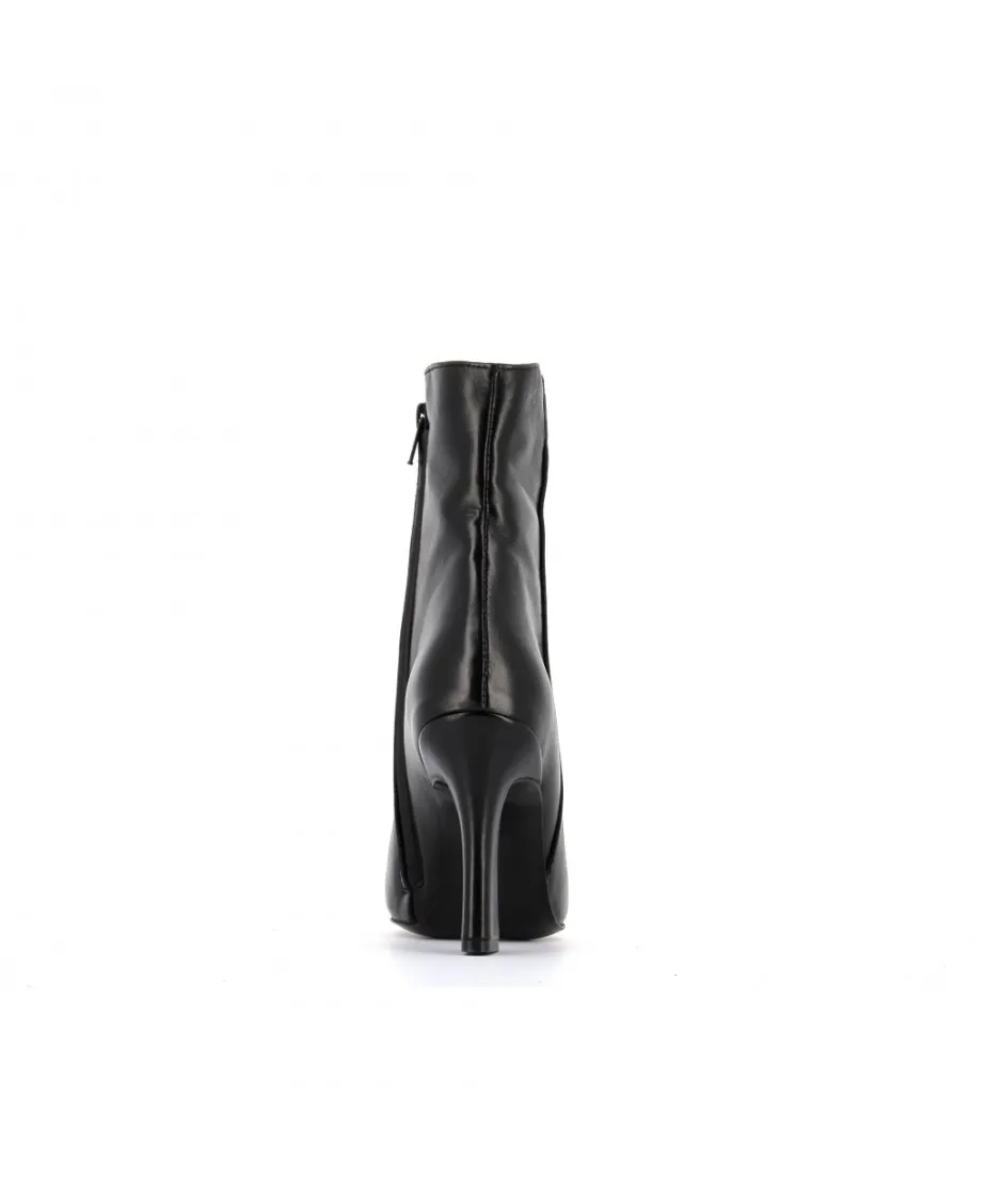 Intemporelles et d’un raffinement absolu les bottines Loubna, signées Osmose Paris, séduisent par leur bout pointu profilé hissées sur un talon architectural d’une hauteur vertigineuse de 10 cm. Fabriquées artisanalement en Italie en cuir lisse noir, elles présentent un zip sur le quartier interne pour faciliter son enfilage.