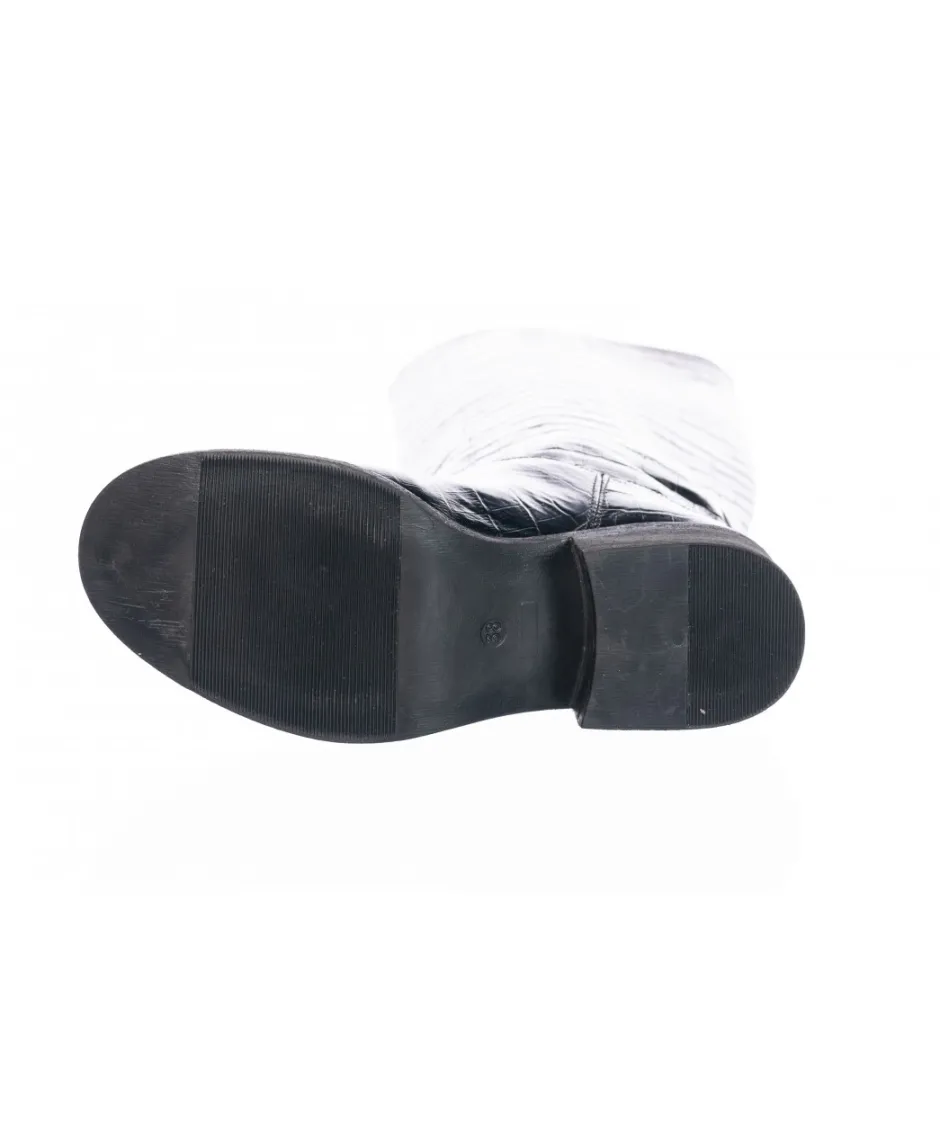 Nouvelle invitation un brin rétro chic signée OSMOSE Shoes Paris : botte cavalière cuir croco imprimé vernis noir à bout rond. OSMOSE, s’engage davantage dans le retour de botte femme sans talon pour votre plus grand plaisir de briller tout en style sur une hauteur agréable de jour comme de nuit. Découpe à la tige redondante qui s’adapte à toutes vos morphologies en all made Italy.