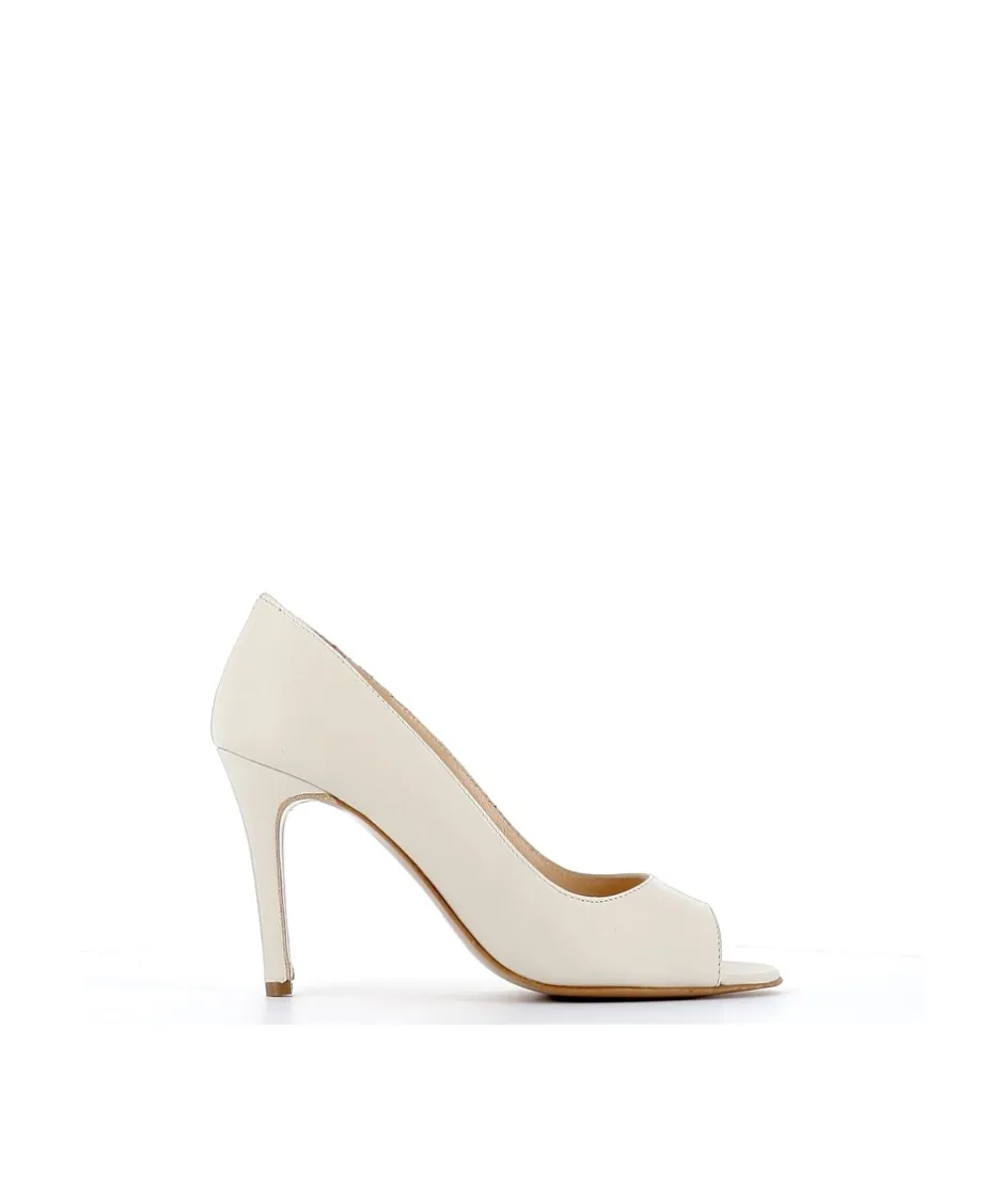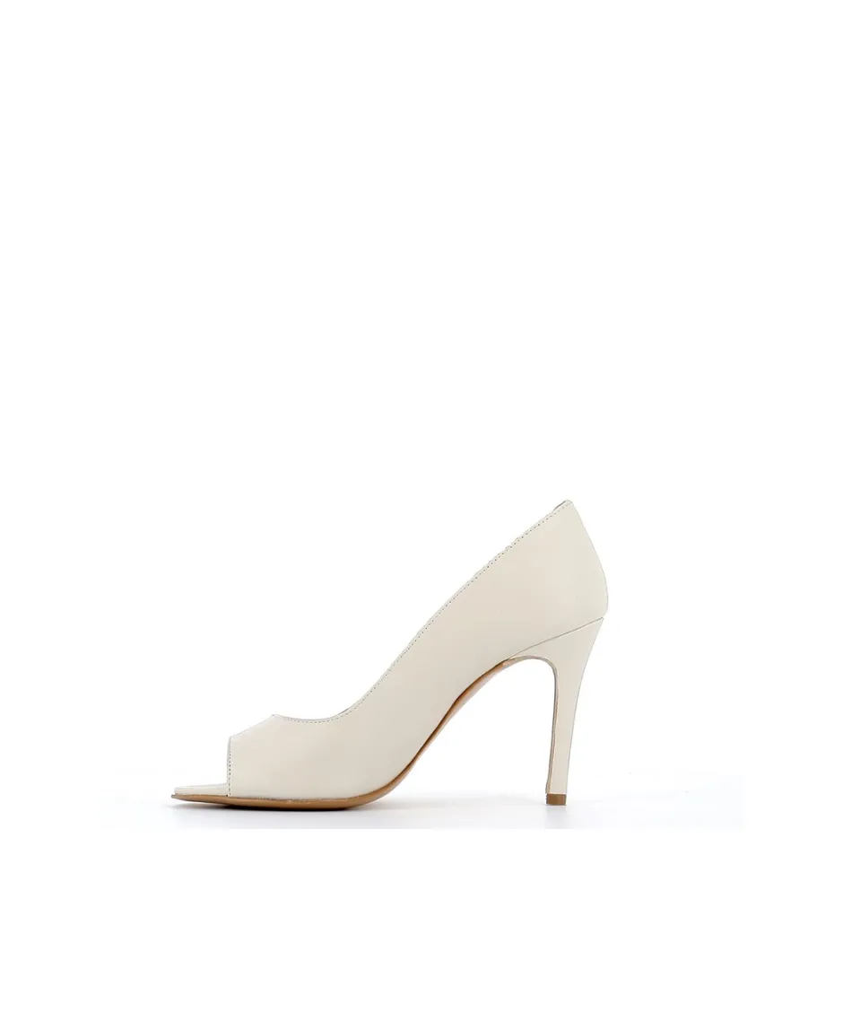Prenez de la hauteur tout en confort avec les escarpins Lydia signés Osmose Paris. Réalisés artisanalement en Italie en cuir écru, ils arborent un bout ouvert et sont montés sur un talon aiguille haut de 11cm pour une démarche assurée en toute circonstance.