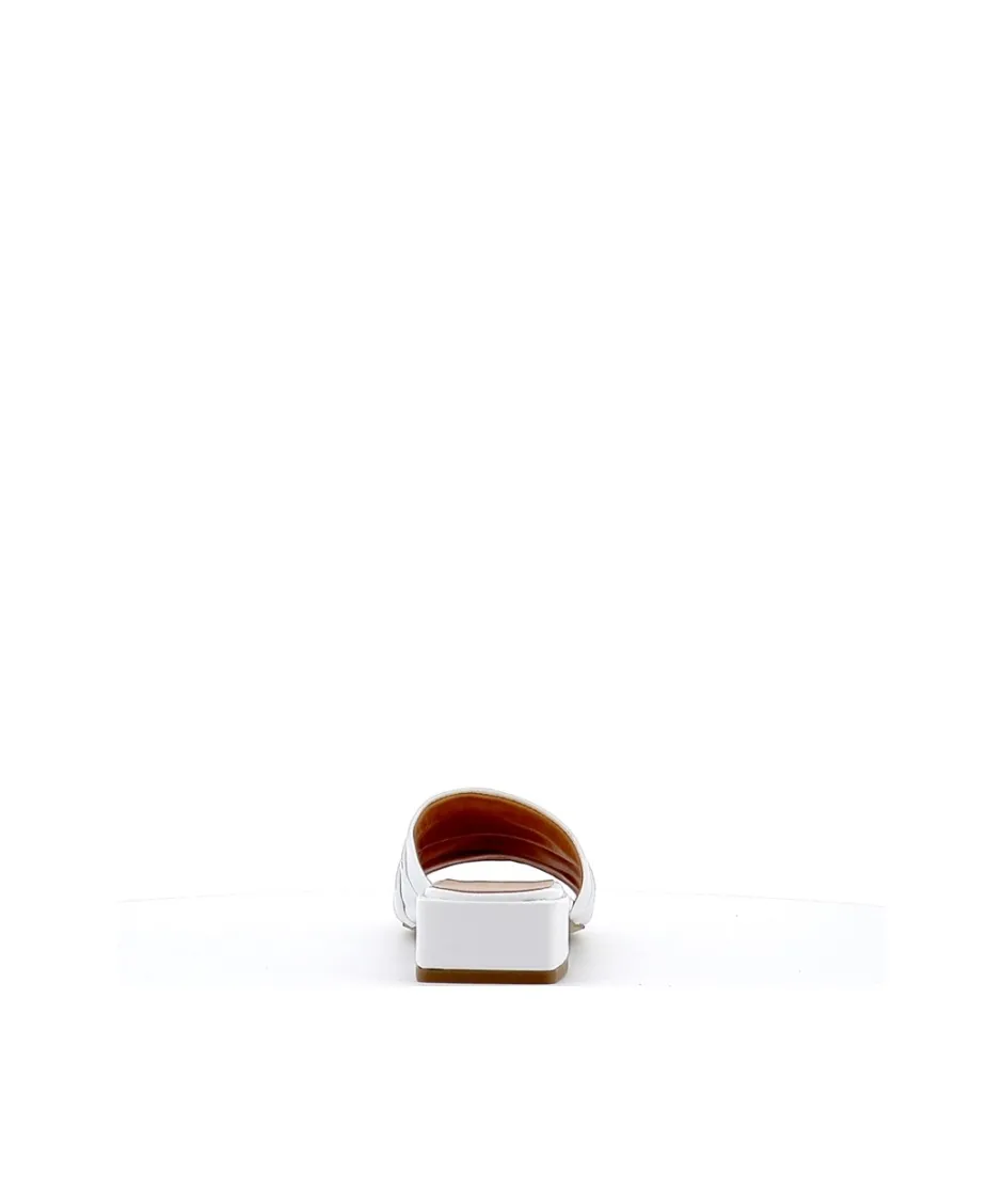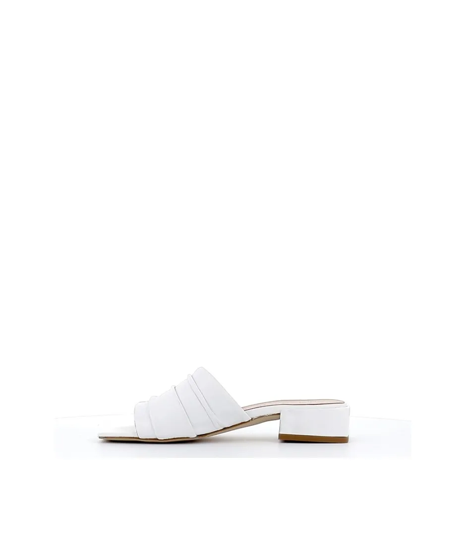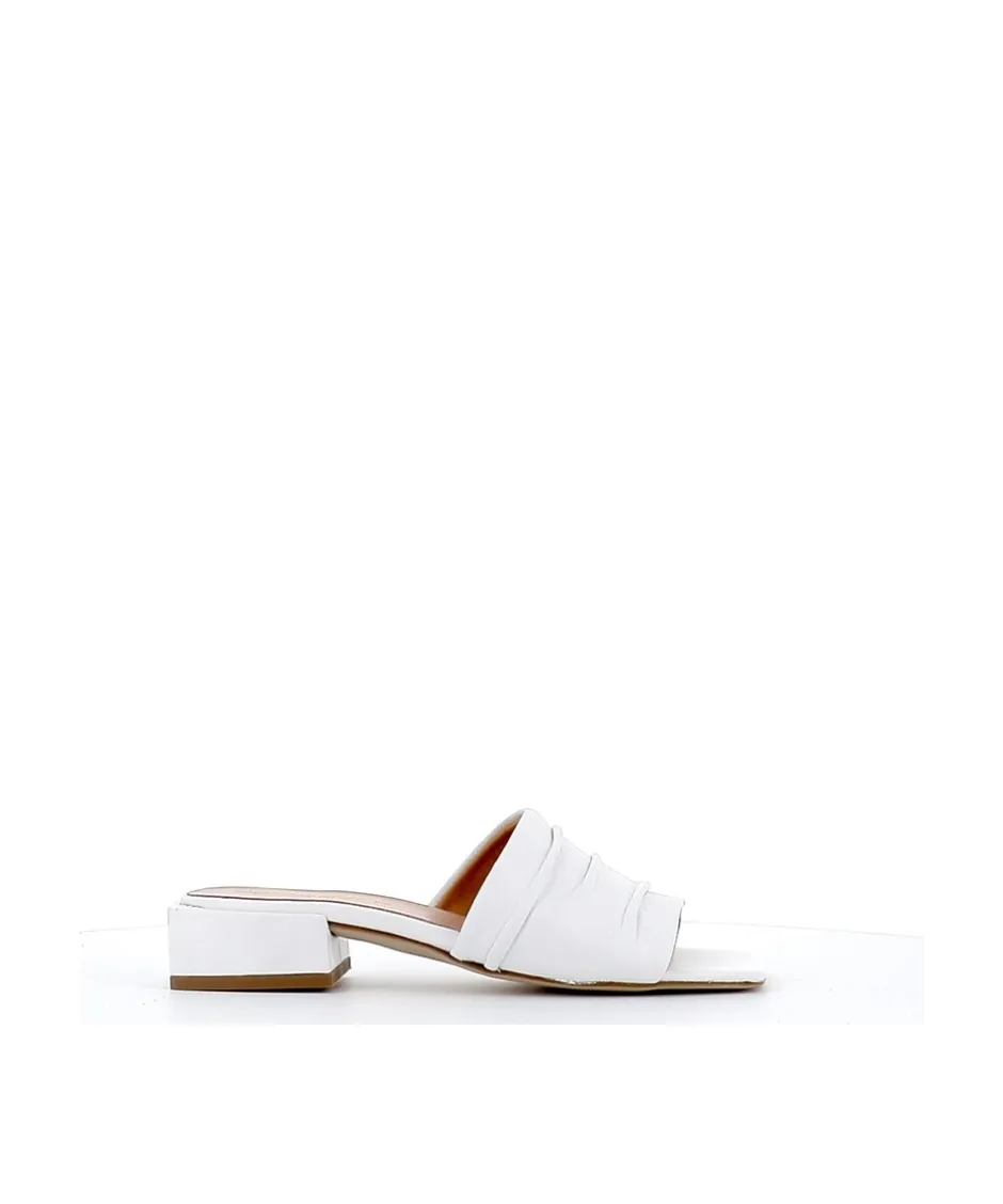 Apportez la touche finale à toutes vos tenues d鈥é avec les mules Livia, signée Osmose Paris. Confectionnée en Italie en cuir blanc, ces sandales intemporelles et passe-partout se démarque par sa large bride plissée et son épais talon discret et confortable.