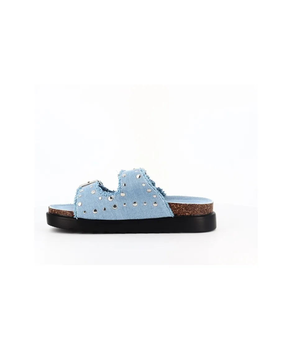 Offrez-vous une touche d’éclat avec ces sandales minimalistes à double bride. Confectionnées en denim jean clair et ornées de clous argentés, elles ajoutent une élégance décontractée à votre tenue.