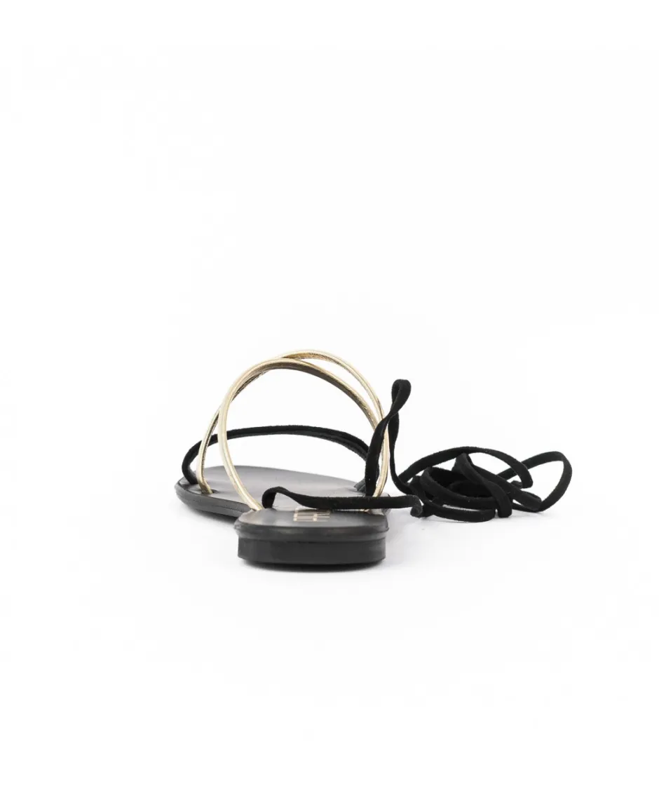 Faites de votre sandale Osmose Shoes Paris, l’atout charme de votre tenue. Confectionnée en Italie en daim noir et cuir platine , elle est montée sur une semelle plate tout confort et se dote de brides s’enroulant avec élégance autour du pied et de la cheville. Portez-la de jour comme de nuit.