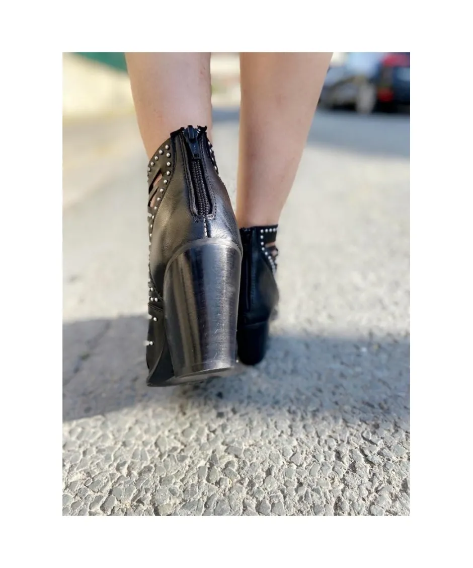 La combinaison cuir et clous argent pour un style rock & urban unique, soyez lookée & chic cette saison sur la bottine tendance de cet été, signée OSMOSE Shoes Paris.