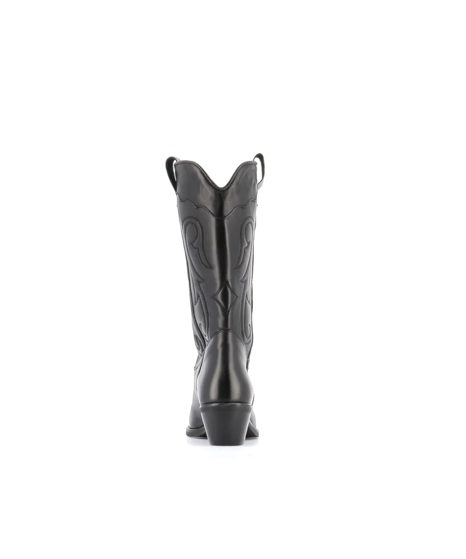 Osmose Shoes Paris vient une nouvelle fois puiser son inspiration dans l’Ouest américain pour signer ces bottines façon santiags en cuir lisse noir, reposant sur un talon incurvé, cette paire affûtée se distingue par ses surpiqûres noires ton sur ton.